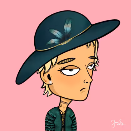Collection Depressed Citizens Artist Juls Description ART. No team, no project, no future. Depressed Citizens is an urban & existential Art expression on Ordinals. In a parallel universe, "THEI" control us. DC unites against toxic society, encouraging critical thinking. 100% hand made collection that took Juls more than 6 months of daily work. Name Citizen#1906 Origin Caucasian non hispanic Gender Woman Necklace Choker Hat Floppy feather hat Mustache Beard No beard Glasses No Glasses Earrings Tragus star earring Hair Style Shaggy shorts with bangs Clothes Golden black halterneck top Tattoo Rose tattoo Star Background Without stars