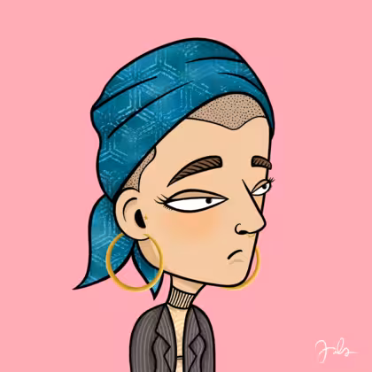 Collection Depressed Citizens Artist Juls Description ART. No team, no project, no future. Depressed Citizens is an urban & existential Art expression on Ordinals. In a parallel universe, "THEI" control us. DC unites against toxic society, encouraging critical thinking. 100% hand made collection that took Juls more than 6 months of daily work. Name Citizen#2074 Origin Caucasian non hispanic Gender Woman Necklace No Necklace Hat Printed head scarf Mustache Beard No beard Glasses No Glasses Earrings Tragus star earring Hair Style Shaved head Clothes Beige turtleneck sweater Tattoo No Tattoo Star Background Without stars