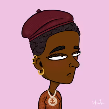 Collection Depressed Citizens Artist Juls Description ART. No team, no project, no future. Depressed Citizens is an urban & existential Art expression on Ordinals. In a parallel universe, "THEI" control us. DC unites against toxic society, encouraging critical thinking. 100% hand made collection that took Juls more than 6 months of daily work. Name Citizen#1462 Origin African descendant Gender Woman Necklace Pearl necklace Hat Burgundy beret Mustache Beard No beard Glasses No Glasses Earrings Helix ring trio Hair Style Short tight curls Clothes Stop deforestation women long-sleeve shirt Tattoo No Tattoo Star Background Without stars