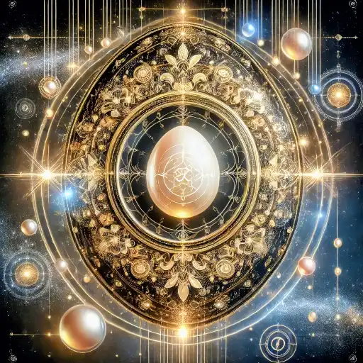 - Cosmic Fabergé-like egg with a pearl core, glowing in a mirrored cosmic frame.