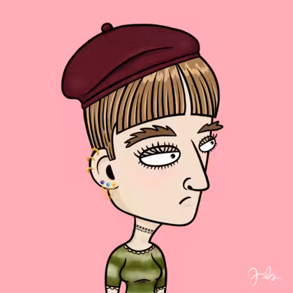 Collection Depressed Citizens Artist Juls Description ART. No team, no project, no future. Depressed Citizens is an urban & existential Art expression on Ordinals. In a parallel universe, "THEI" control us. DC unites against toxic society, encouraging critical thinking. 100% hand made collection that took Juls more than 6 months of daily work. Name Citizen#1974 Origin Caucasian non hispanic Gender Woman Necklace Choker Hat Burgundy beret Mustache Beard No beard Glasses No Glasses Earrings Helix ring trio Hair Style Short pixie with bangs Clothes Granny geen elbow-sleeve shirt Tattoo No Tattoo Star Background Without stars