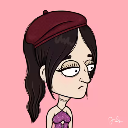 Collection Depressed Citizens Artist Juls Description ART. No team, no project, no future. Depressed Citizens is an urban & existential Art expression on Ordinals. In a parallel universe, "THEI" control us. DC unites against toxic society, encouraging critical thinking. 100% hand made collection that took Juls more than 6 months of daily work. Name Citizen#123 Origin Caucasian non hispanic Gender Woman Necklace Choker Hat Burgundy beret Mustache Beard No beard Glasses No Glasses Earrings Upper lobe rings Hair Style High ponytail Clothes Glitter fuchsia halterneck top Tattoo No Tattoo Star Background Without stars