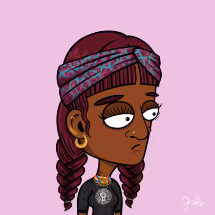Collection Depressed Citizens Artist Juls Description ART. No team, no project, no future. Depressed Citizens is an urban & existential Art expression on Ordinals. In a parallel universe, "THEI" control us. DC unites against toxic society, encouraging critical thinking. 100% hand made collection that took Juls more than 6 months of daily work. Name Citizen#181 Origin African descendant Gender Woman Necklace Colorful layered necklace Hat Printed headband Mustache Beard No beard Glasses No Glasses Earrings Rook hoop Hair Style Double braids with bangs Clothes BLM women shirt Tattoo Rose tattoo Star Background Without stars