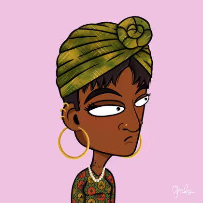 Collection Depressed Citizens Artist Juls Description ART. No team, no project, no future. Depressed Citizens is an urban & existential Art expression on Ordinals. In a parallel universe, "THEI" control us. DC unites against toxic society, encouraging critical thinking. 100% hand made collection that took Juls more than 6 months of daily work. Name Citizen#444 Origin African descendant Gender Woman Necklace Pearl necklace Hat Green turban Mustache Beard No beard Glasses No Glasses Earrings Helix ring trio Hair Style Short pixie Clothes Geometric ethnic long-sleeve dress Tattoo Rose tattoo Star Background Without stars