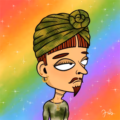 Collection Depressed Citizens Artist Juls Description ART. No team, no project, no future. Depressed Citizens is an urban & existential Art expression on Ordinals. In a parallel universe, "THEI" control us. DC unites against toxic society, encouraging critical thinking. 100% hand made collection that took Juls more than 6 months of daily work. Name Citizen#1898 Origin LGBT-Q+ Gender Non-binary Necklace Choker Hat Green turban Mustache Beard Handlebar & chin puff Glasses No Glasses Earrings Upper lobe strass Hair Style Short pixie with bangs Clothes Green low-neck long-sleeve shirt Tattoo No Tattoo Star Background With stars